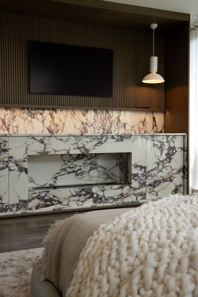 Natural stone continues to be a favored material, but the trend is shifting towards large, seamless slabs with dramatic veining. Marble, with its timeless elegance and unique patterns, is a popular choice for creating a sophisticated and luxurious focal point. Other stones like quartzite, granite, and soapstone are also being used to craft stunning fireplace surrounds that feel both organic and modern. The use of a single, large slab minimizes grout lines and creates a clean, monolithic look that highlights the natural beauty of the stone.